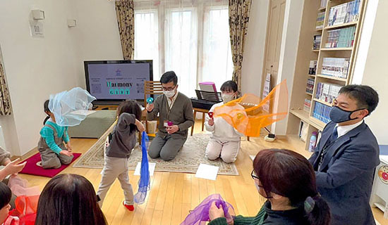 スタッフによるトーンベルメロディーの演奏に合わせて、音を奏でたベルと同じ色のシフォン生地をふわりと投げる聴覚と身体の反射機能アップ体験
