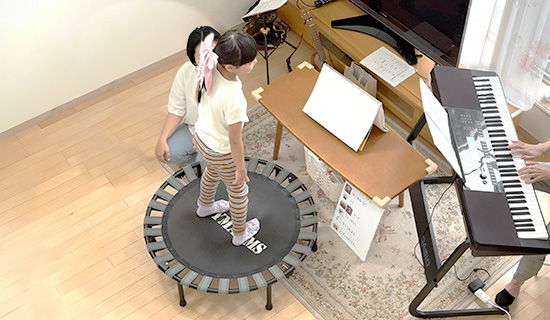 曲のリズムに合わせて、トランポリンでジャンプしたり、身体のバランス感覚とリズム感を高めるプログラム